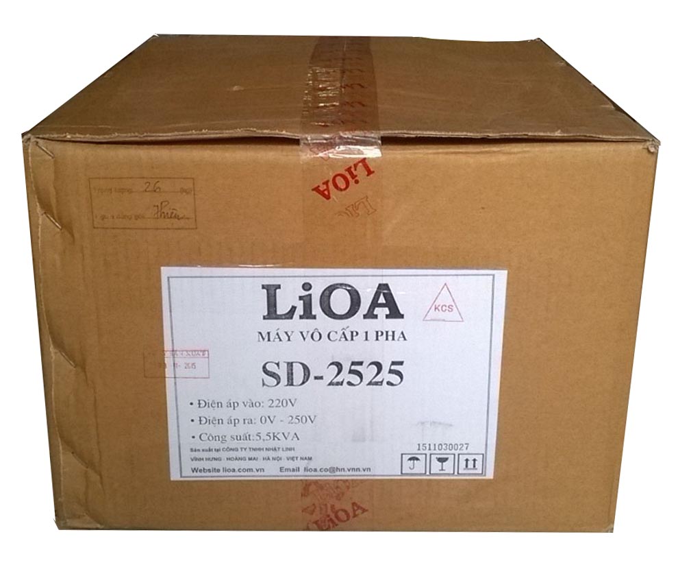 - Biến áp vô cấp lioa SD - 2525 có công suất tối đa so với điện áp đầu ra 220v là 5.5kva