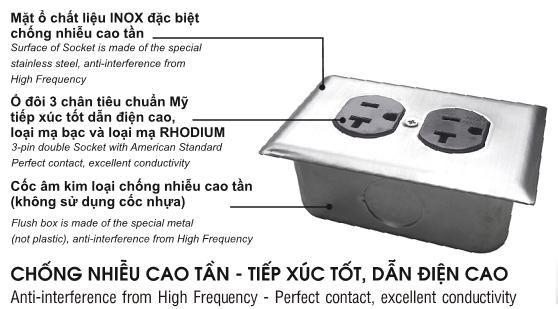 2. Ổ đôi 3 chân tiêu chuẩn Mỹ tiếp xúc tốt dẫn điện cao, loại mạ bạc và loại mạ RHODIUM
