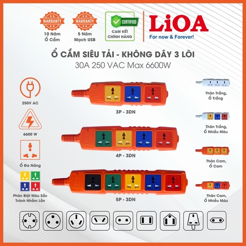 - Ổ cắm kéo dài có nắp che LiOA 6D dây 5m x 2 LiOA 6D52WN (Trắng) có hệ thống chống quá tải bằng CB với thiết kế 6 ổ cắm tiêu chuẩn phù hợp với mọi loại phích cắm có trên thị trường sẽ giúp bạn cung cấp điện cho nhiều thiết bị cùng lúc một cách tiện lợi.