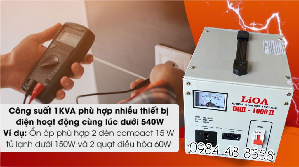 Ổn áp LIOA công suất 1KVA có công suất 1KVA, sử dụng được cho nhiều thiết bị điện cùng lúc với tổng công suất của chúng khoảng 540W.