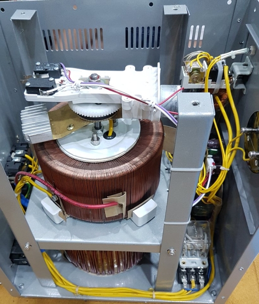 + Cấu tạo bên trong máy gồm 1 lõi xuyến ổn áp + 1 bộ mạch điều khiển điện áp , khi có sự chênh lệch điện áp đầu vào mạch sẽ điều khiển động cơ quay chổi than => dưới phần ổn áp là Biến áp chịu tải chính cho toàn bộ điện áp ra ( Không qua chổi than )