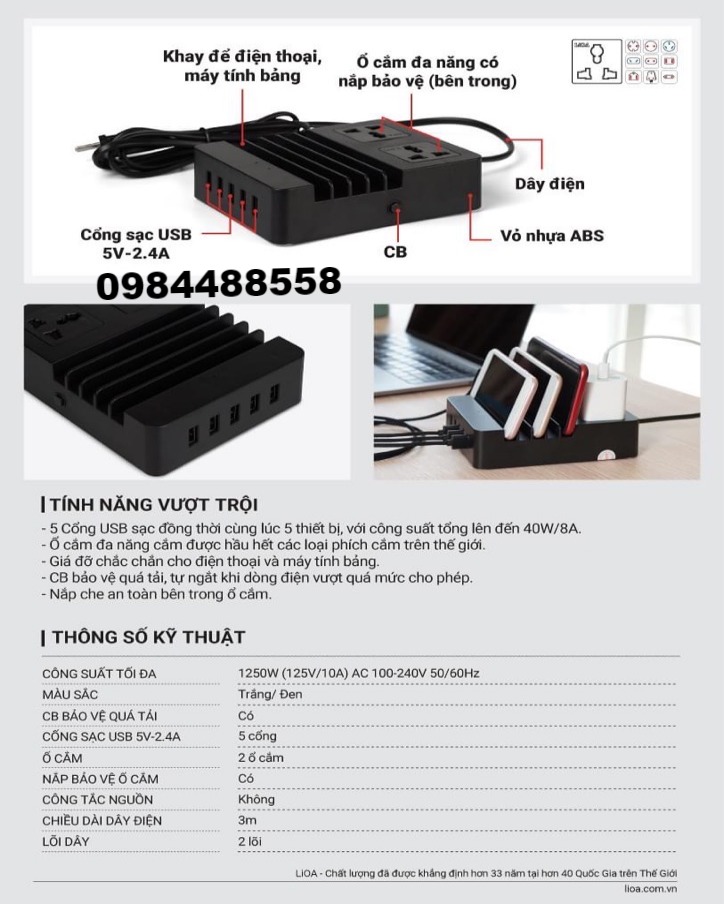 - Dây điện dài 3m do LiOA sản suất đảm bảo theo TCVN và IEC, thuận tiện cho việc di chuyển.